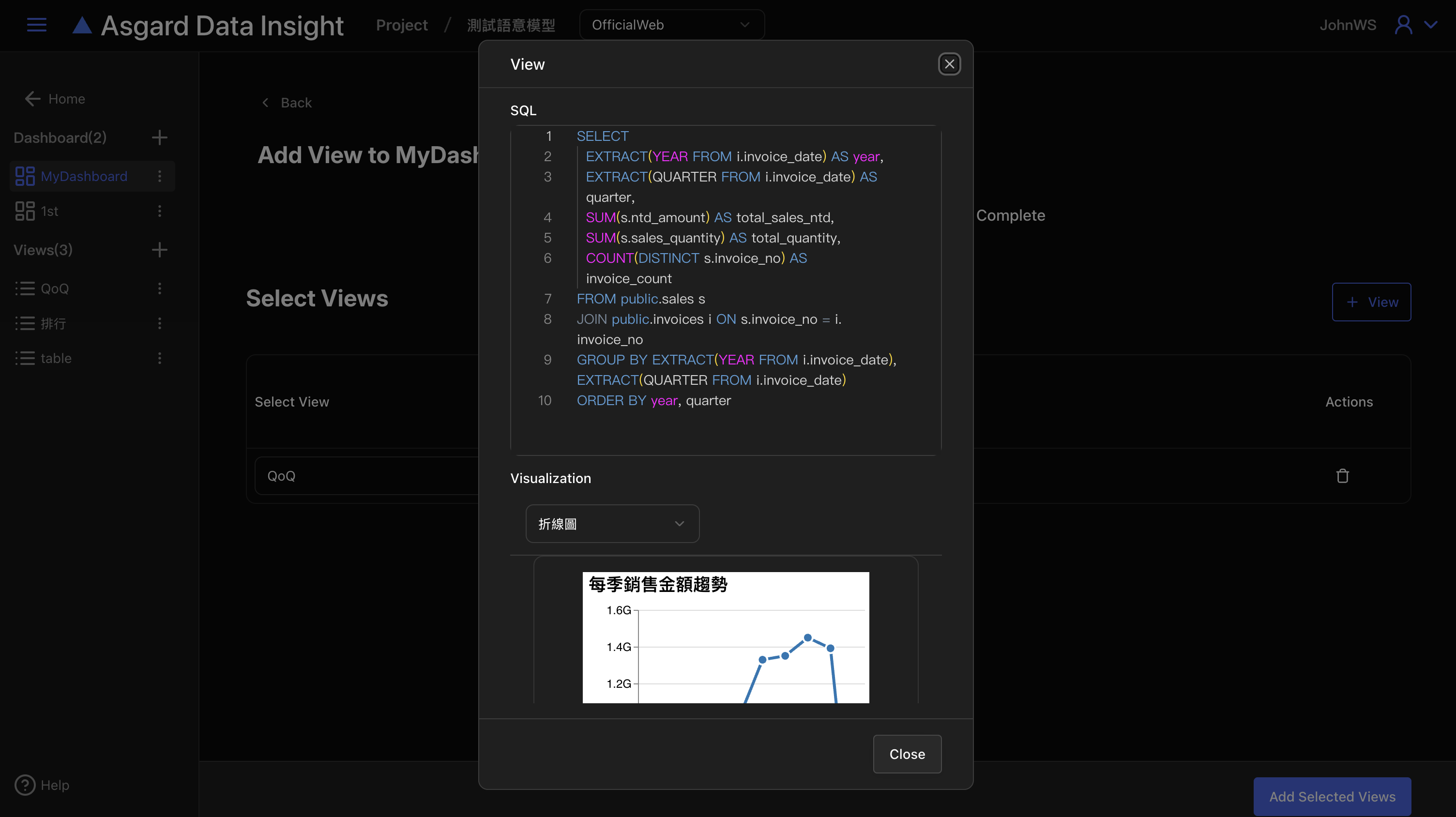 確認後點擊「Add View to Dashboard」即可。此 處會列出已加入的圖表名稱與描述。
