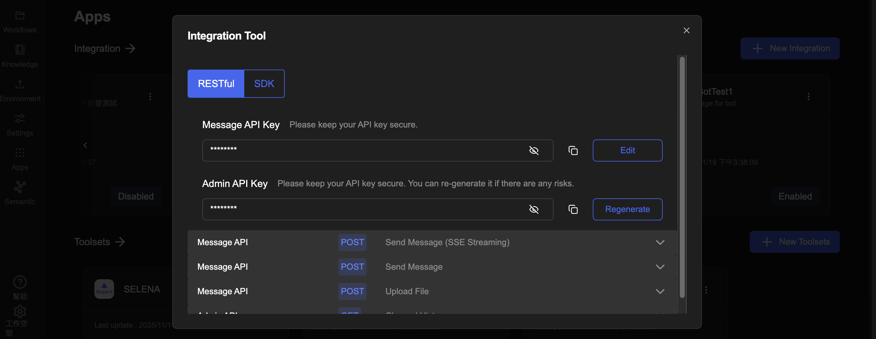| Message API Key | Generic (Bot) | 呼叫 Message API 時填入。 | 點右側複製圖示即可貼用;要換新 Key,按 Edit 回到 Integrated 編輯模式,在 Auth 設定重新儲存即可。 |