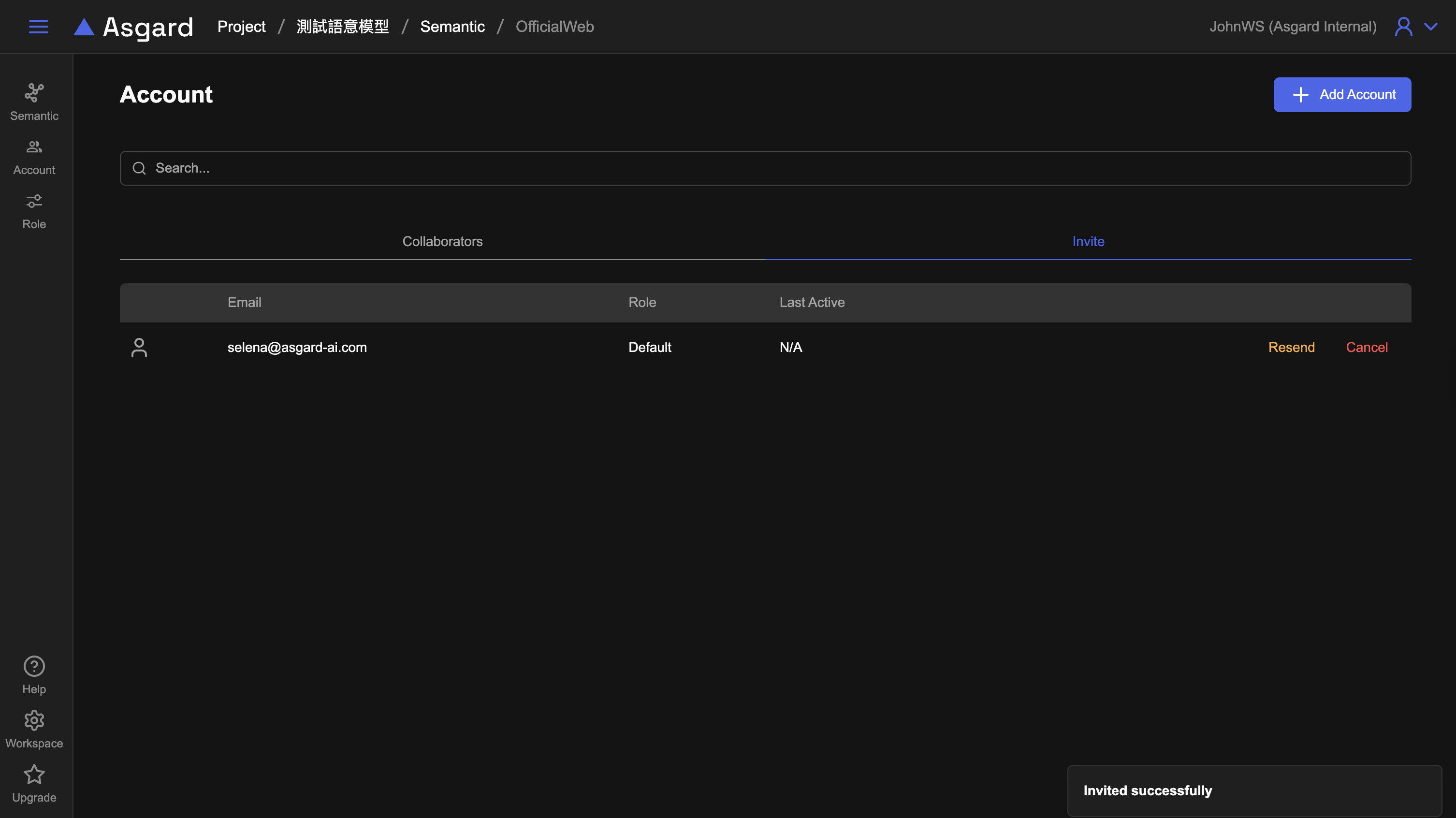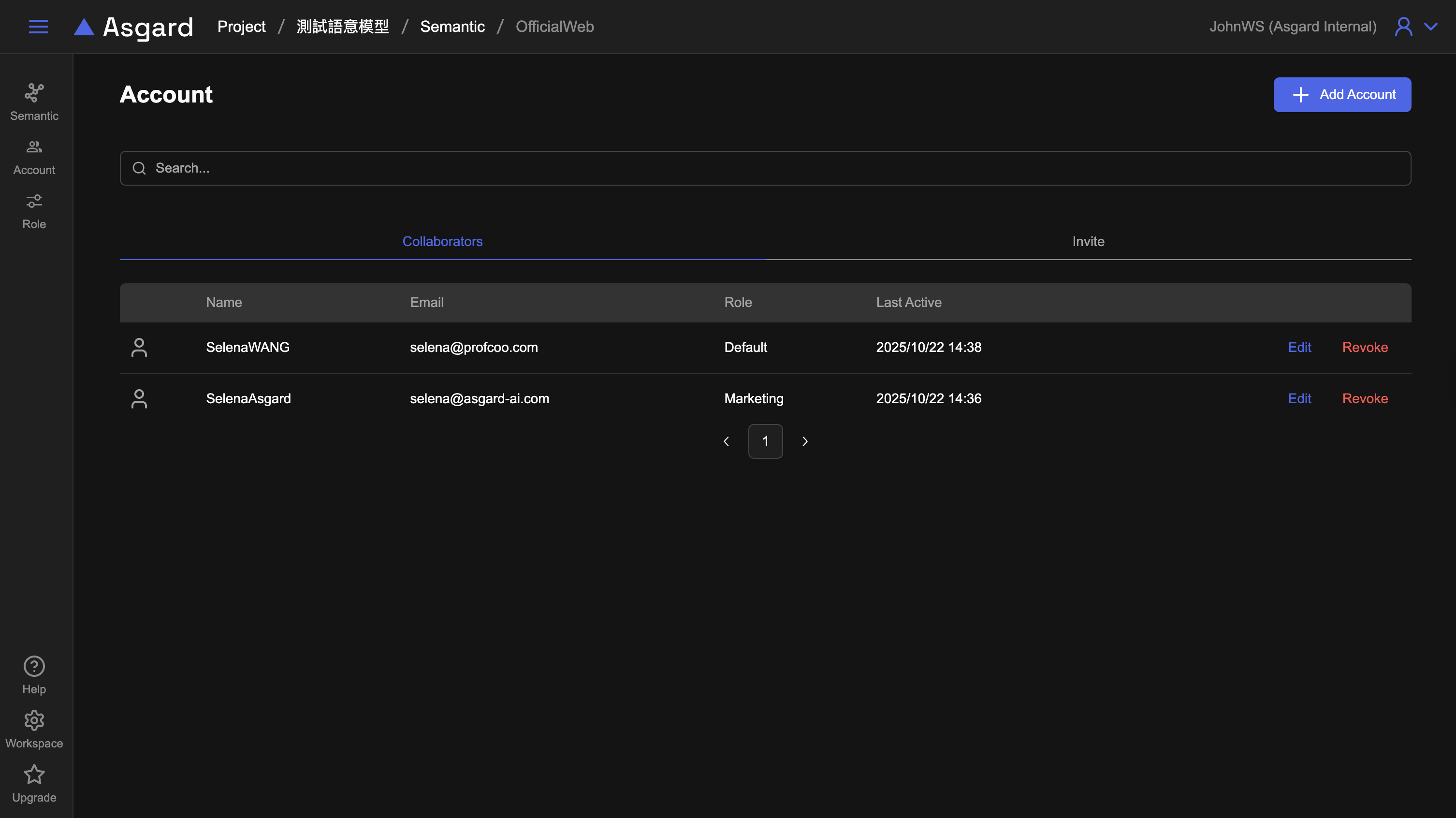 開始使用 AsgardSemantic Model模型存取帳號與權限本頁導覽模型存取帳號與權限語意資料模型擁有獨立的權限角色管理功能,採用基於角色的存取控制 (RBAC) 來管理 Data Insight 的使用者在系統中存取的模型與操作。 檢視或移除成員存取權限 點擊「Account」可以檢視當前語意資料模型的存取帳號與對應權限,預設權限為「Default」可以存取所有模型中的資料表。 邀請新帳號