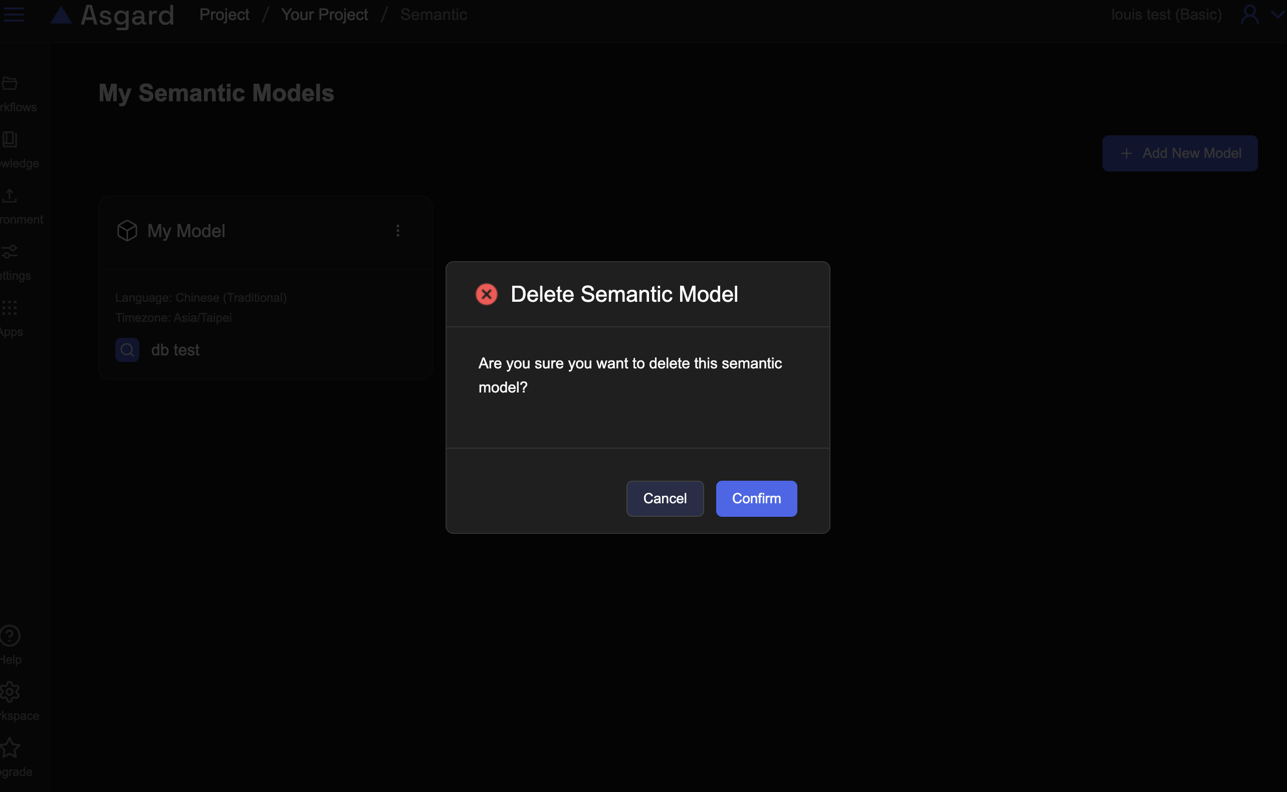 點擊刪除會跳出確認對話,按下確認後即可刪除。注意:所有與此語意資料模型相關的Data Insight也會一起刪除,該動作無法復原。