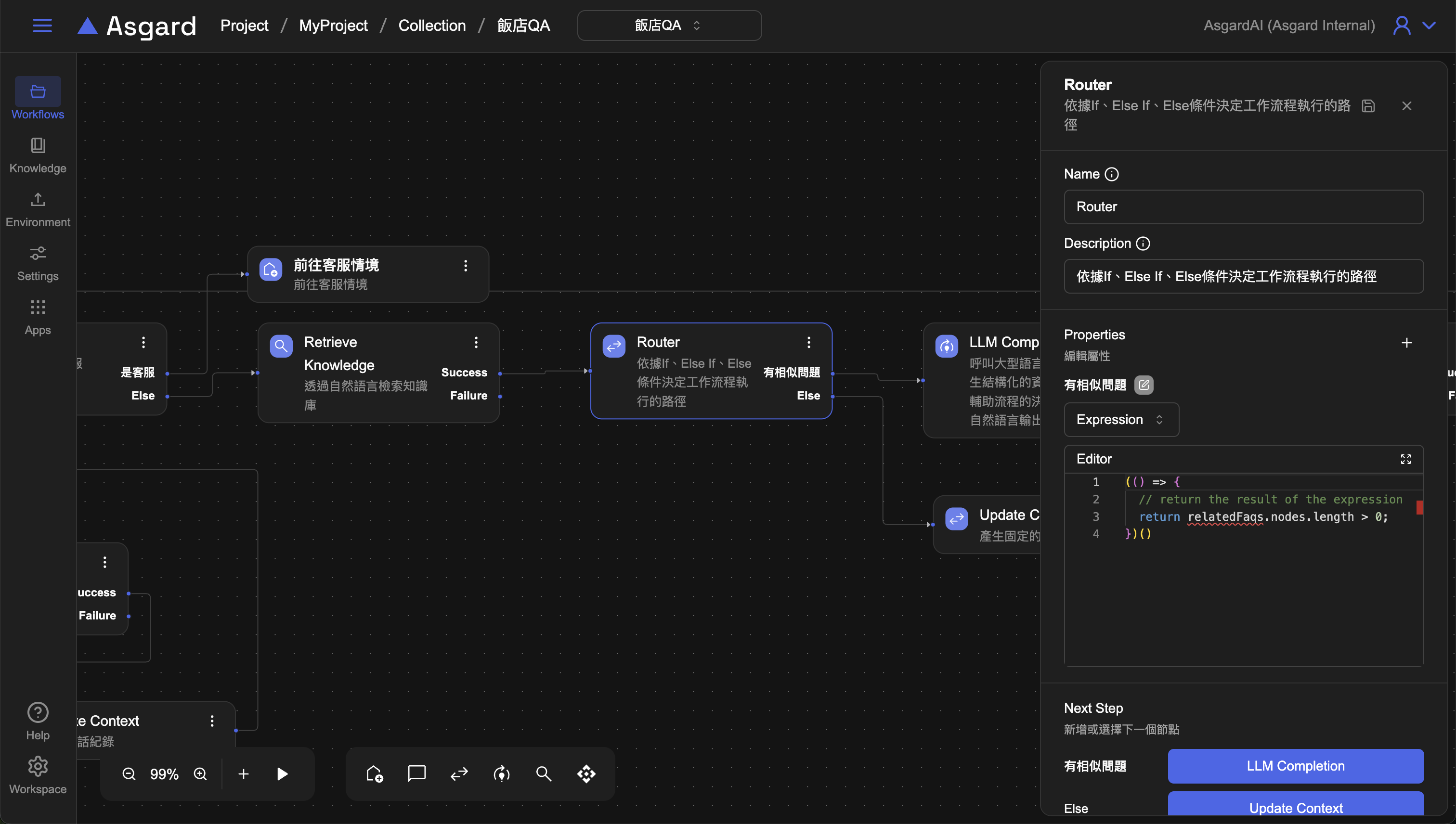 - 新增 Case 1 條件名稱可以自訂,此處改成「有相似問題」來幫助識別。選擇 Expression 並輸入以下範例: