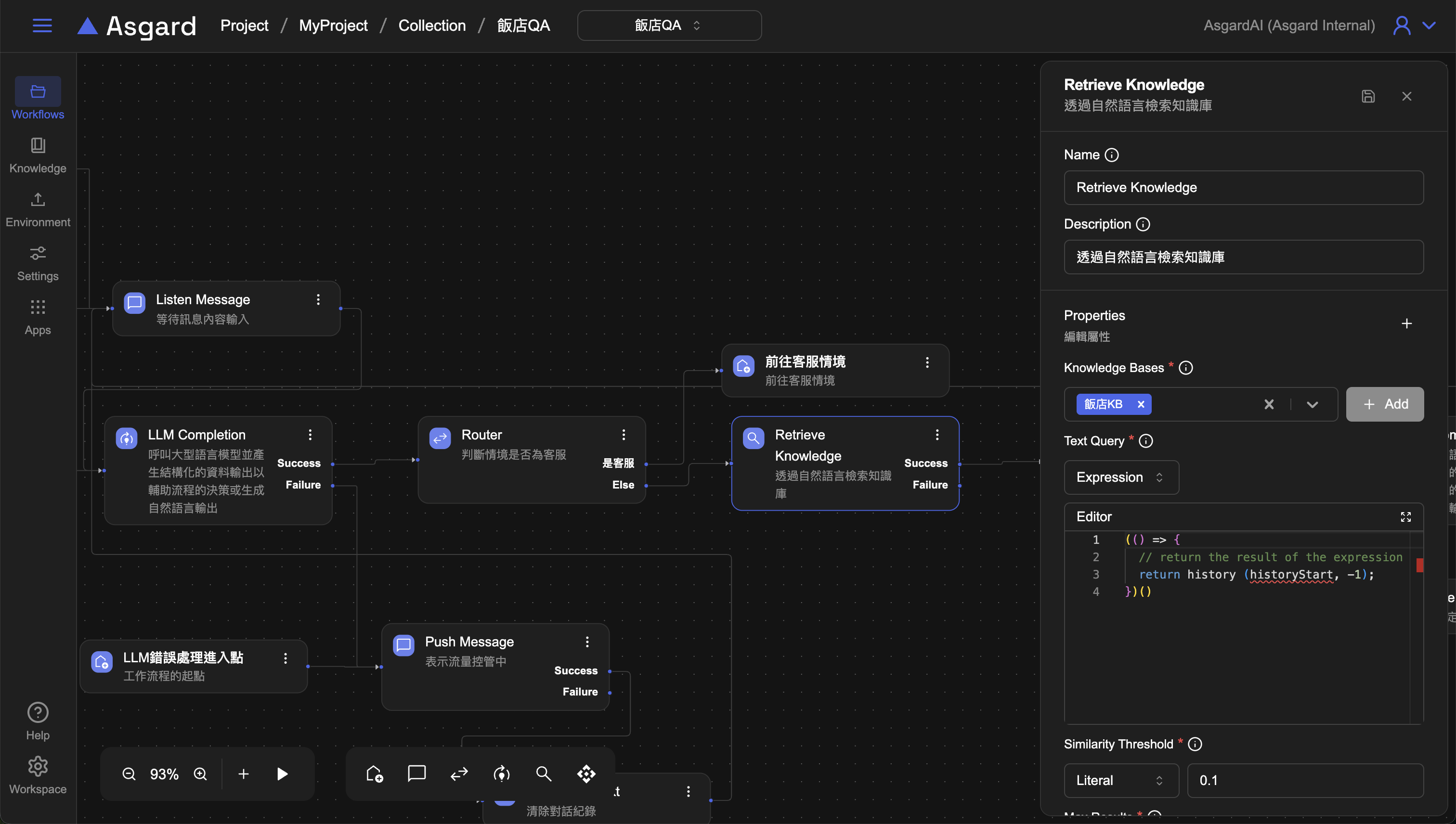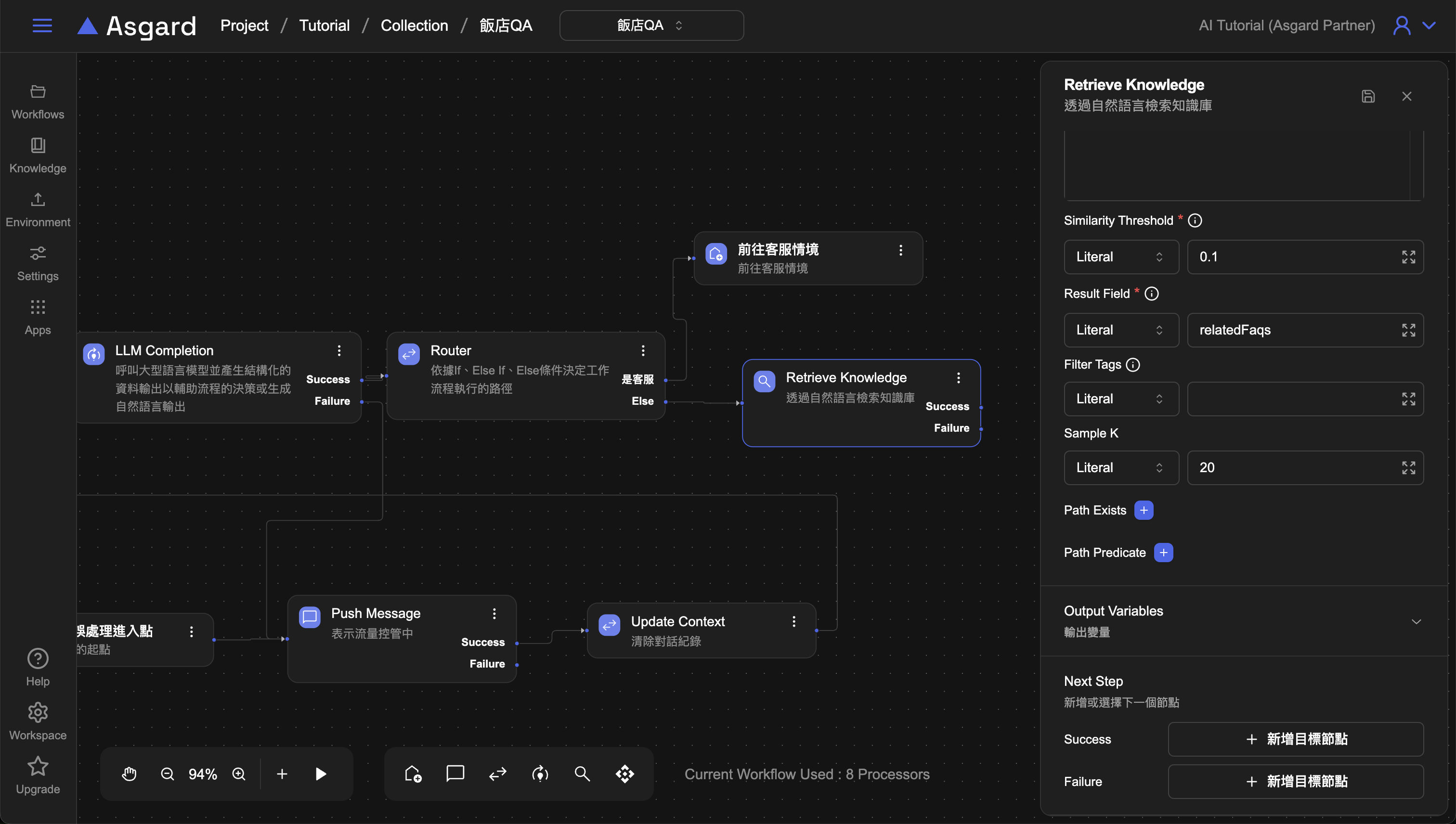- Similarity Threshold 填入 0~1 之間的數字,1 代表最相似,以此遞減。範例使用 0.1 這個數值,因為用戶的問題相關性可能不高,因此選用 0.1 這個數值。