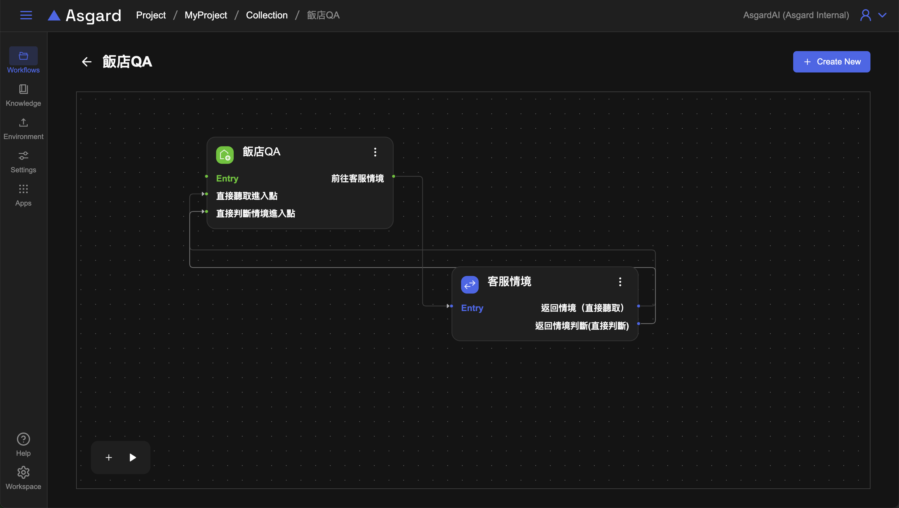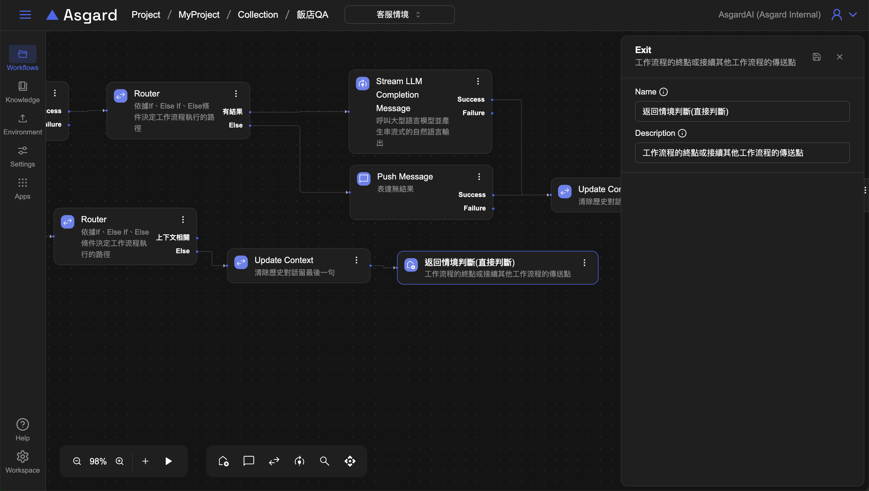 將 Exit「返回情境判斷(直接判斷)」 與 Entry 「直接判斷情境進入點」連接便完成了 AI 找不到回答的流程處理,並能將用戶導向到先前設計的 LLM Completion 去直接判斷是否為客服情境。