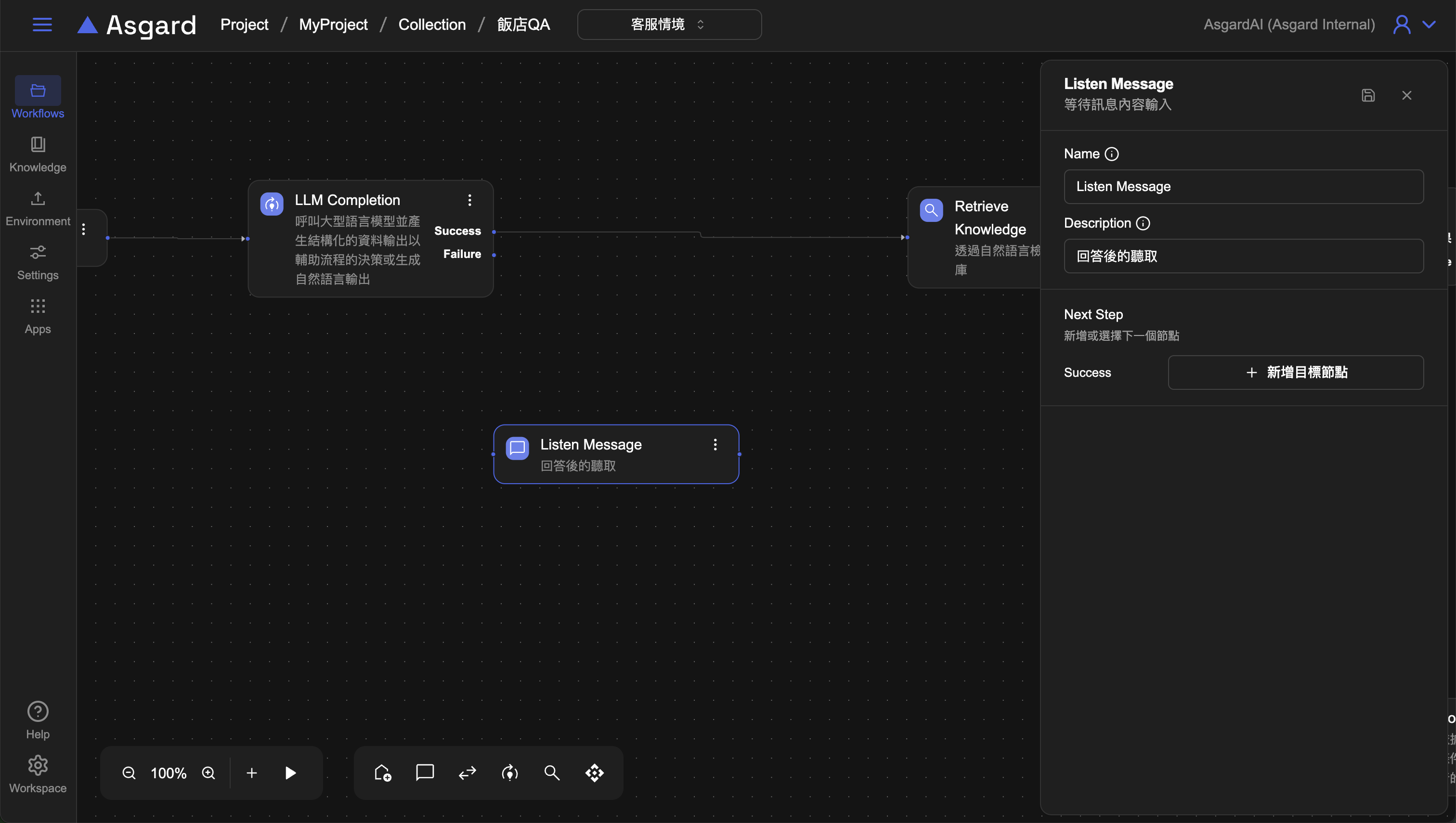 回到飯店 QA 的 Workflow 並新增一個進入點,可直接點擊上方的飯店 QA 回到 Workflow Sets 選取或是使用頂端列的選單切換,新增後修改名稱與描述為「直接判斷情境進入點」,並將該節點連接到 Listen Message。