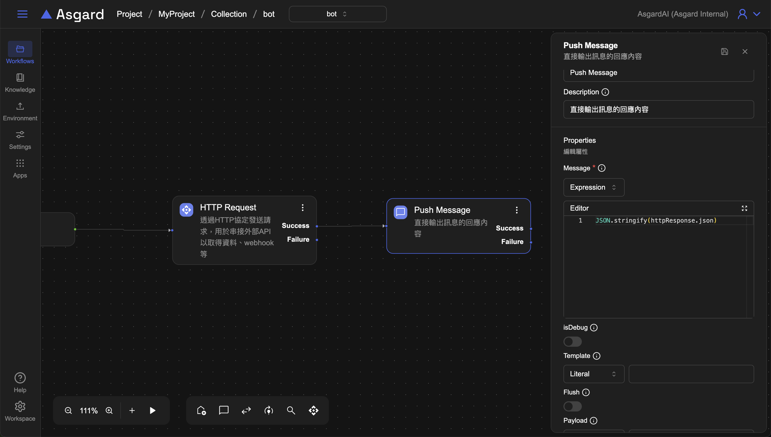 - Message 選擇 Expression 的類型,並輸入底下範例