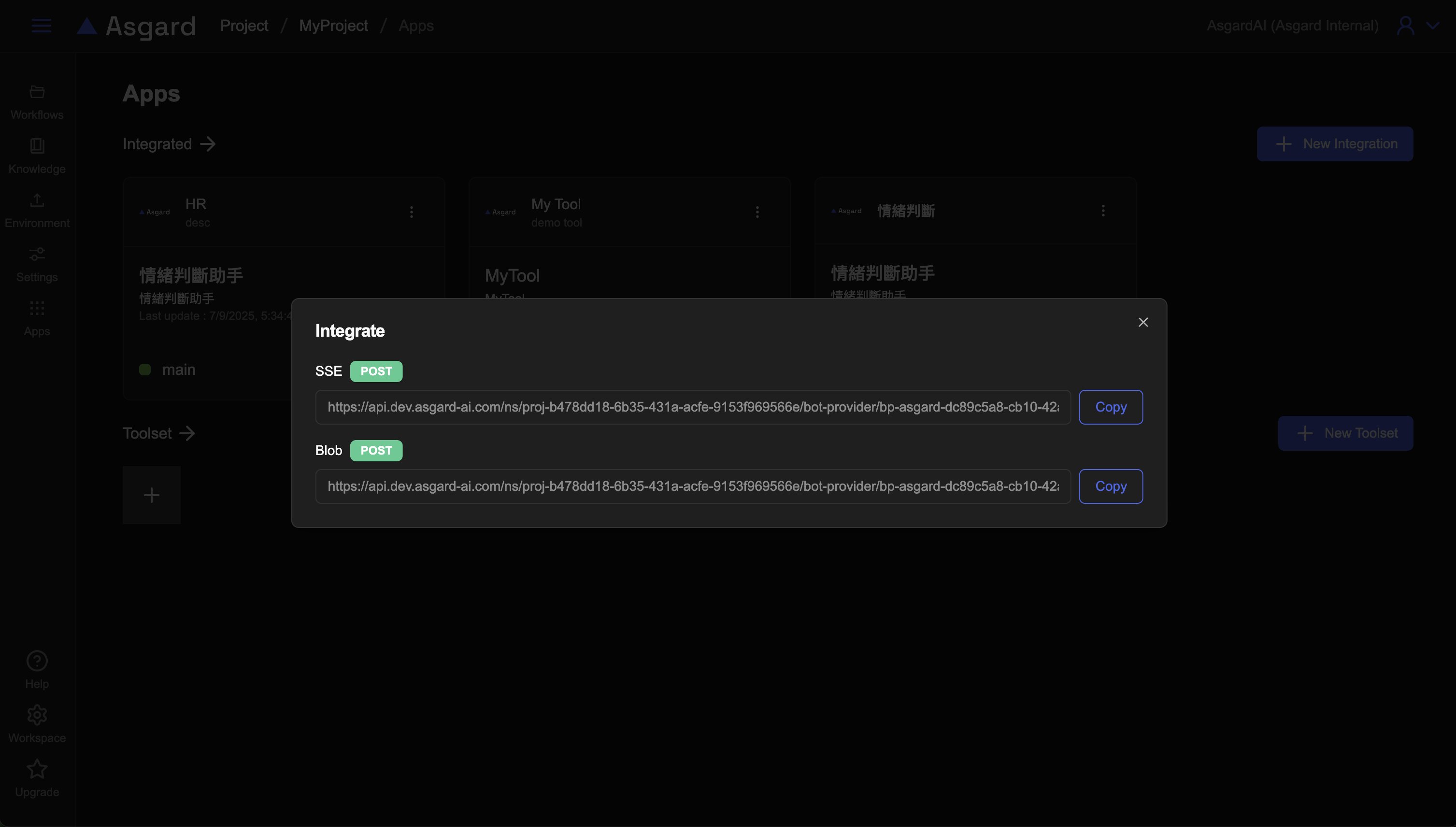點擊左側 Apps 功能進入 AI App 功能區,首次進入會是空的,請點擊 New Integration 來建立一個新的 AI App 整合應用。接著填入對應的資訊並選擇應用類型即可,預設建立完成後會自動啟用該 App。