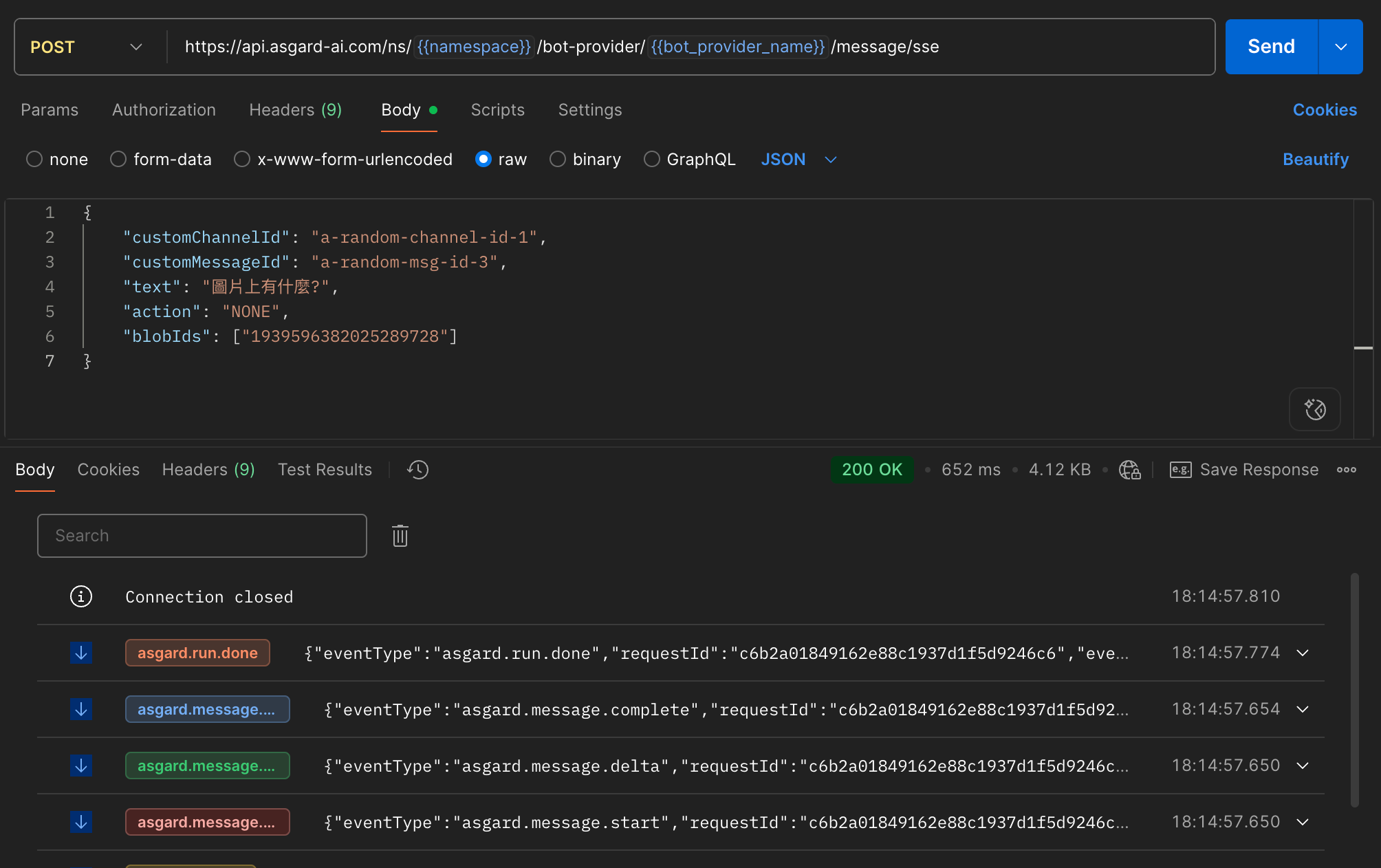 注意:請求方式是採用 SSE(Server-Sent Events)方式,與一般 API 不同,請求後會持續收到一連串事件資料,而不是一次性回應。