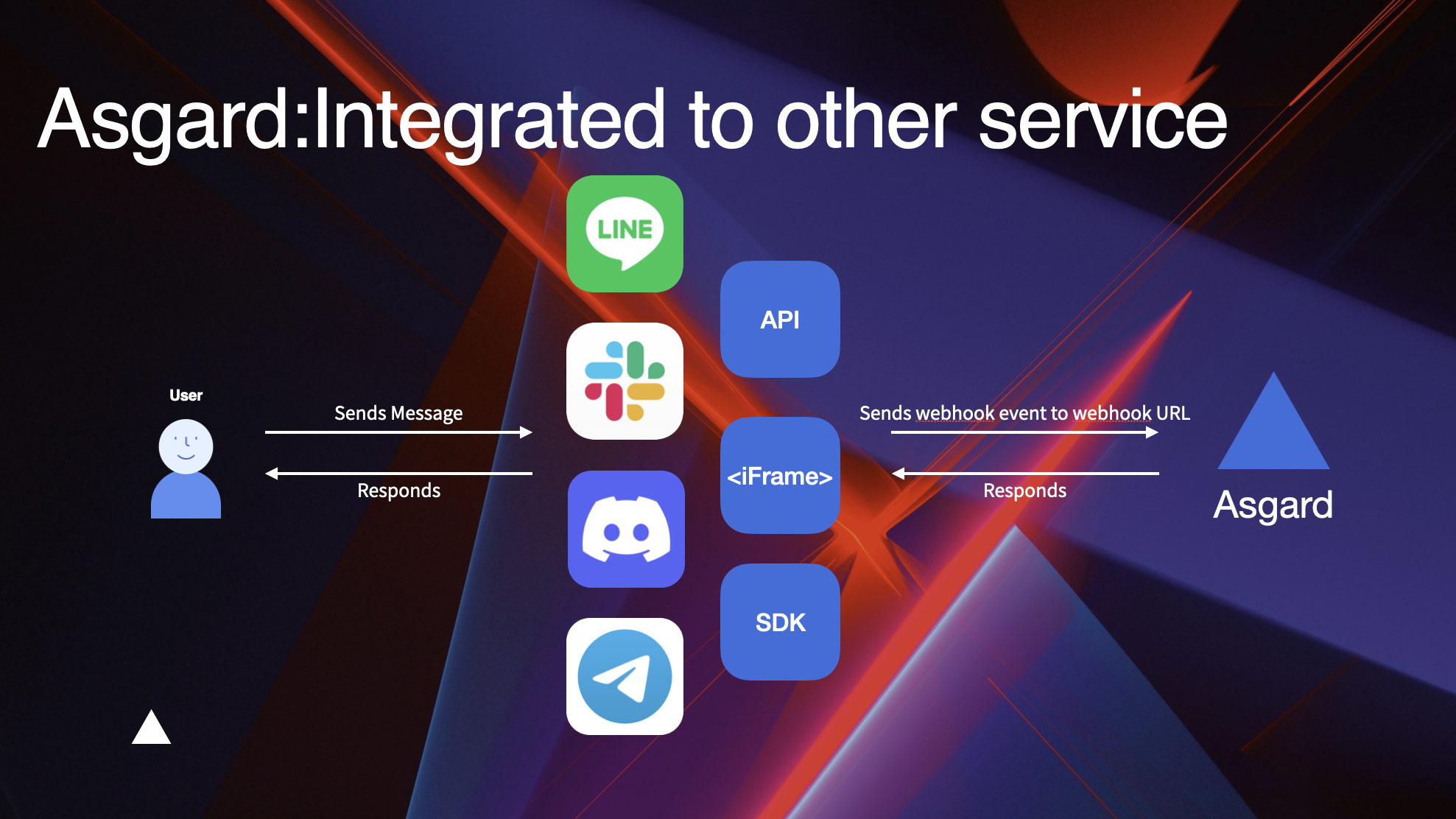 Asgard 提供了設定應用 Apps 與 iFrame 發佈與工具集( Toolset ),讓您在完成工作流程編排並且預覽正常後,直接整合至現有服務例如 LINE、Discord、Slack、Telegram 等,亦可用 Asgard 的 Generic App 來彈性的自訂畫面或是使用 Public iFrame 的功能,讓您能馬上將 Asgard Bot 嵌入至現有服務中,快速驗證價值。