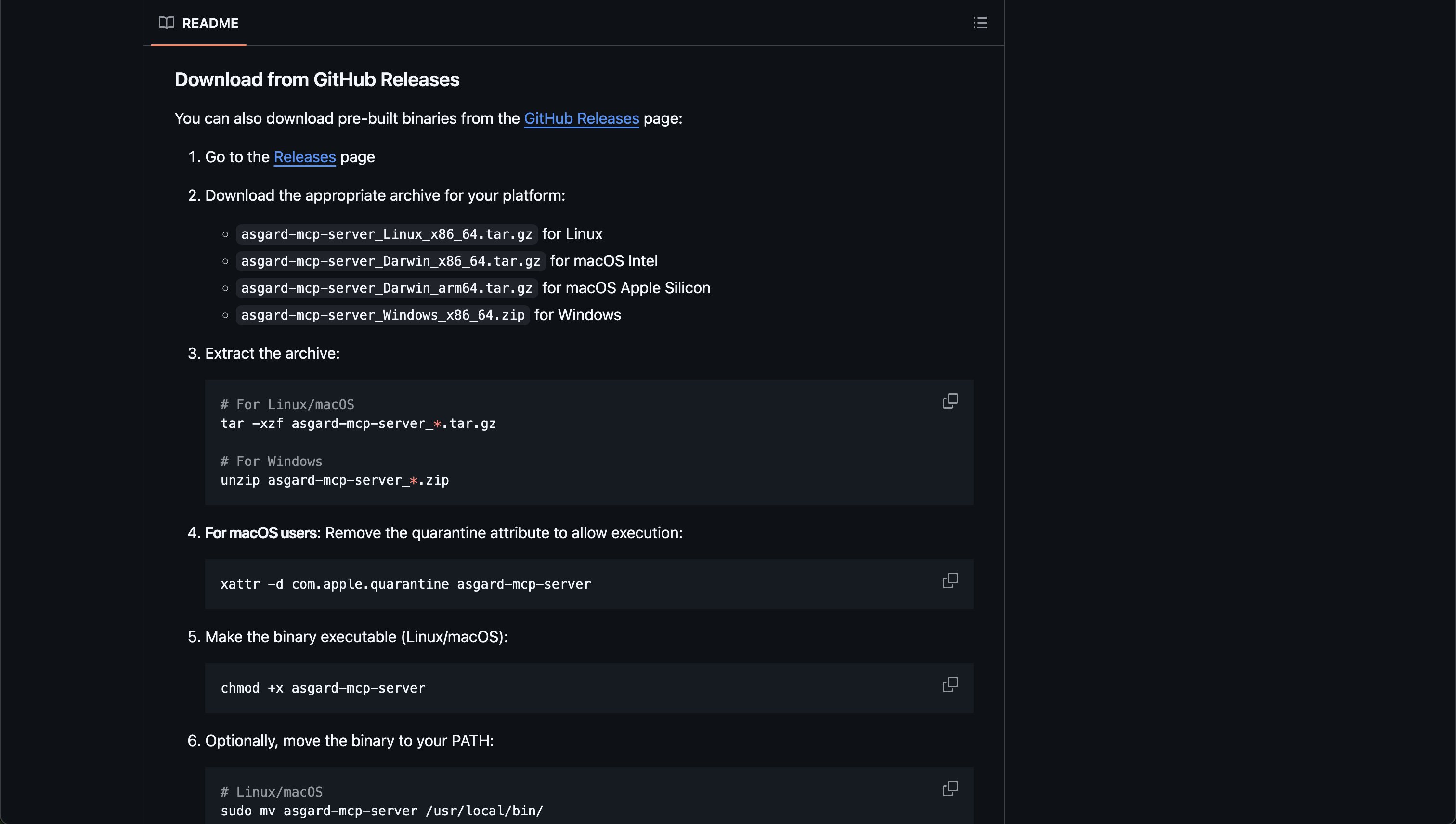 - 前往 Asgard 的 MCP 下載說明頁面:Asgard MCP Server GitHub並依據安裝說明操作。