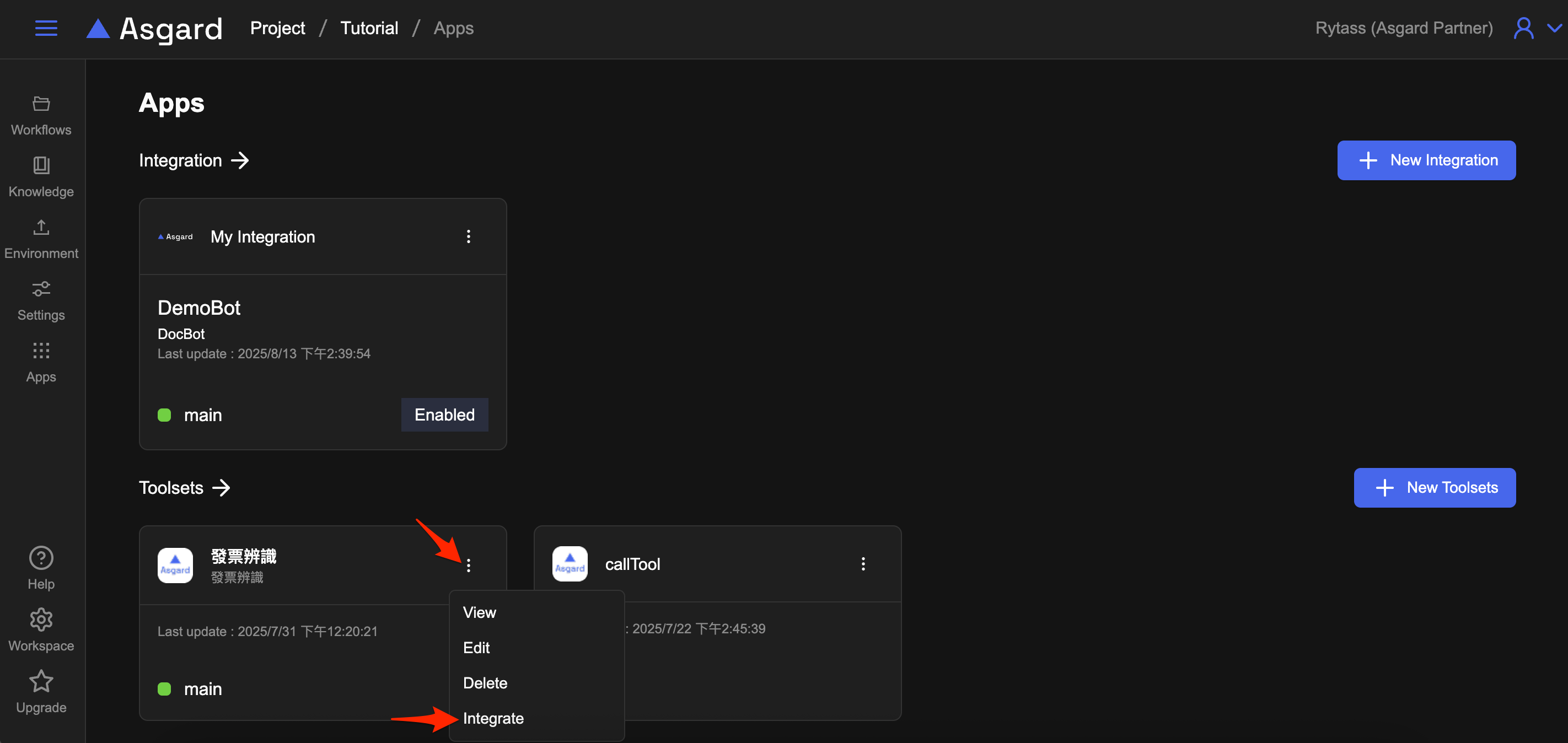 - 從 Toolsets 右上角點擊更多按鈕展開選單,選擇 Integrate 頁面