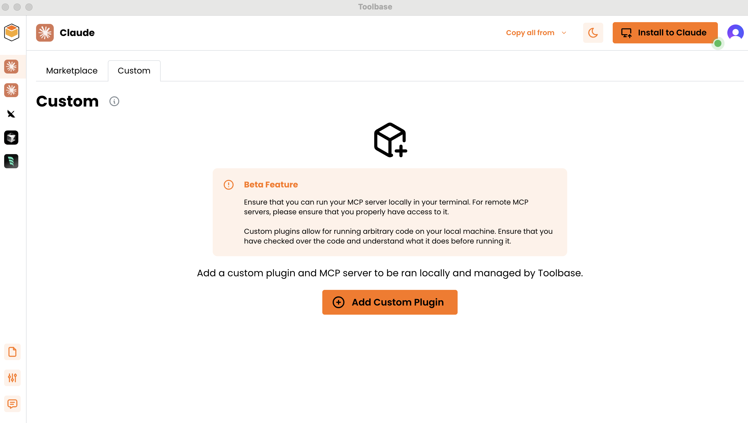 以 Toolbase 為例,點擊 Add Custom Plugin → 填入Name → Type: Local →填入 Command 後儲存。