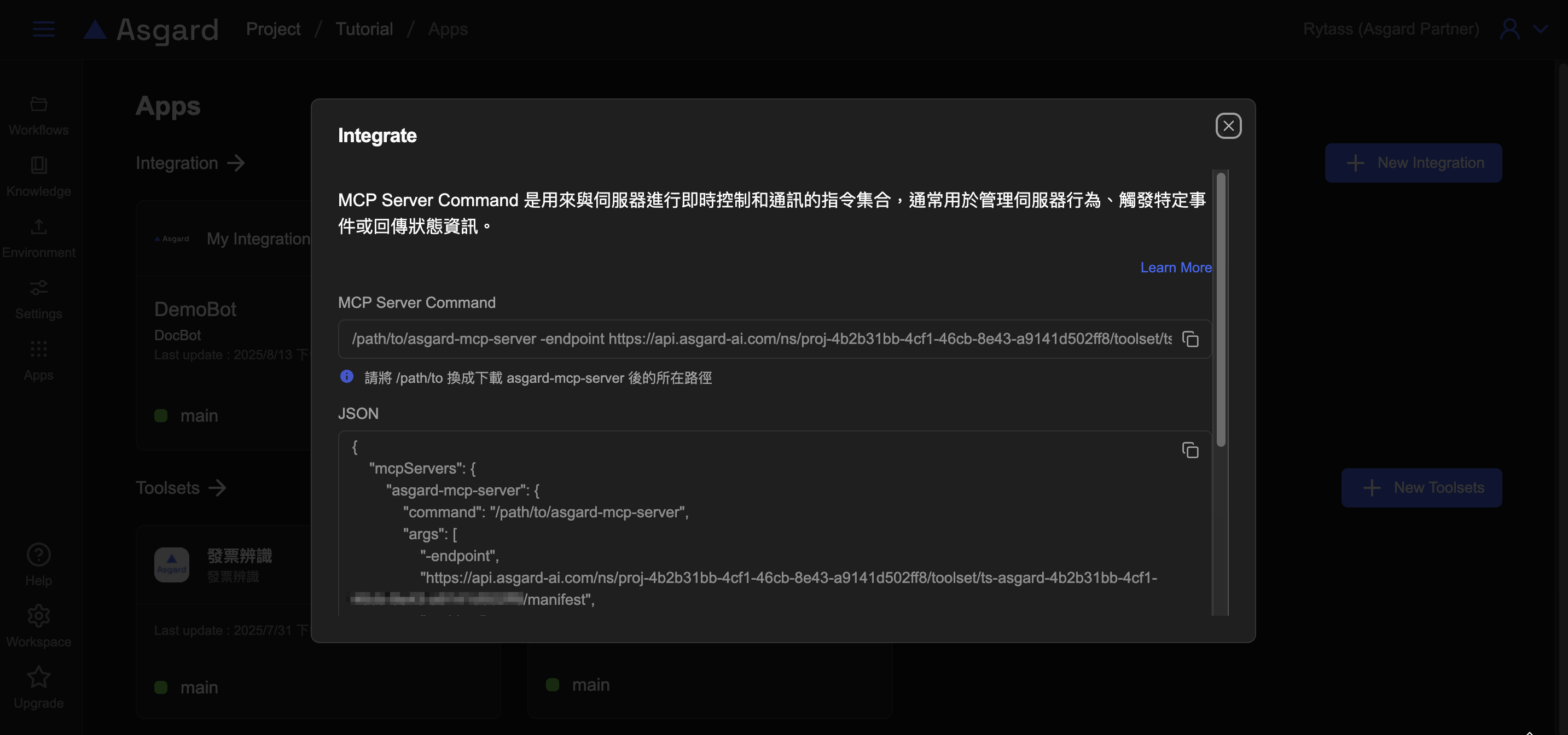 在 Asgard 中,你可以將 Toolsets 作為 MCP Server 來使用,讓你能夠在電腦上的 MCP Host 中直接使用 Asgard 的功能。