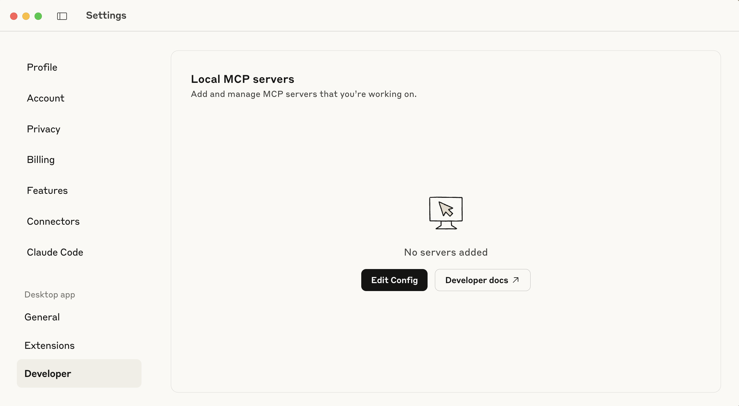 以 Claude Desktop 為例,開啟 Settings → Developer → Edit Config