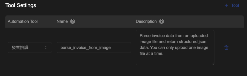 展開內容可以看到 Toolset 的工具名稱,也就是先前在新增 Tool 時設定好的名稱(e.g.parse_invoice_from_image)。