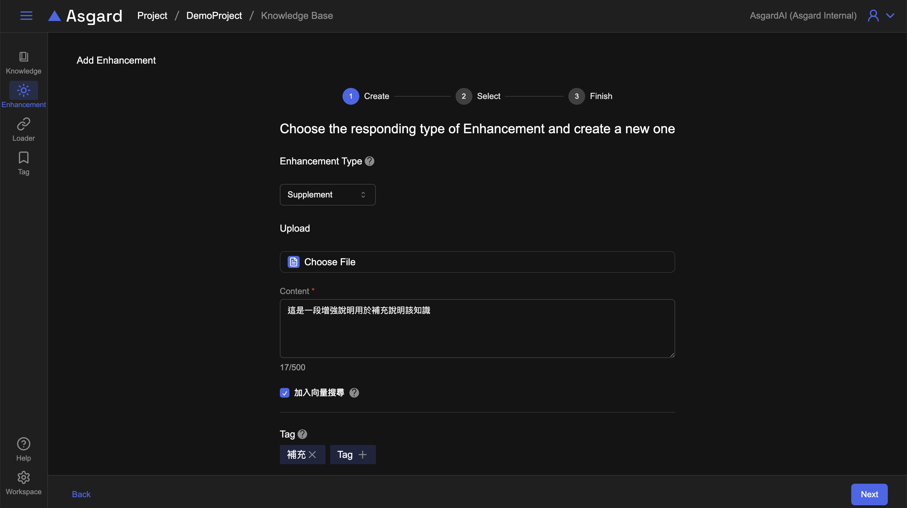 針對該 Enhancement 可以上傳檔案(選填)作為補充資料與說明;可以勾選是否要將該增強加入向量搜尋。