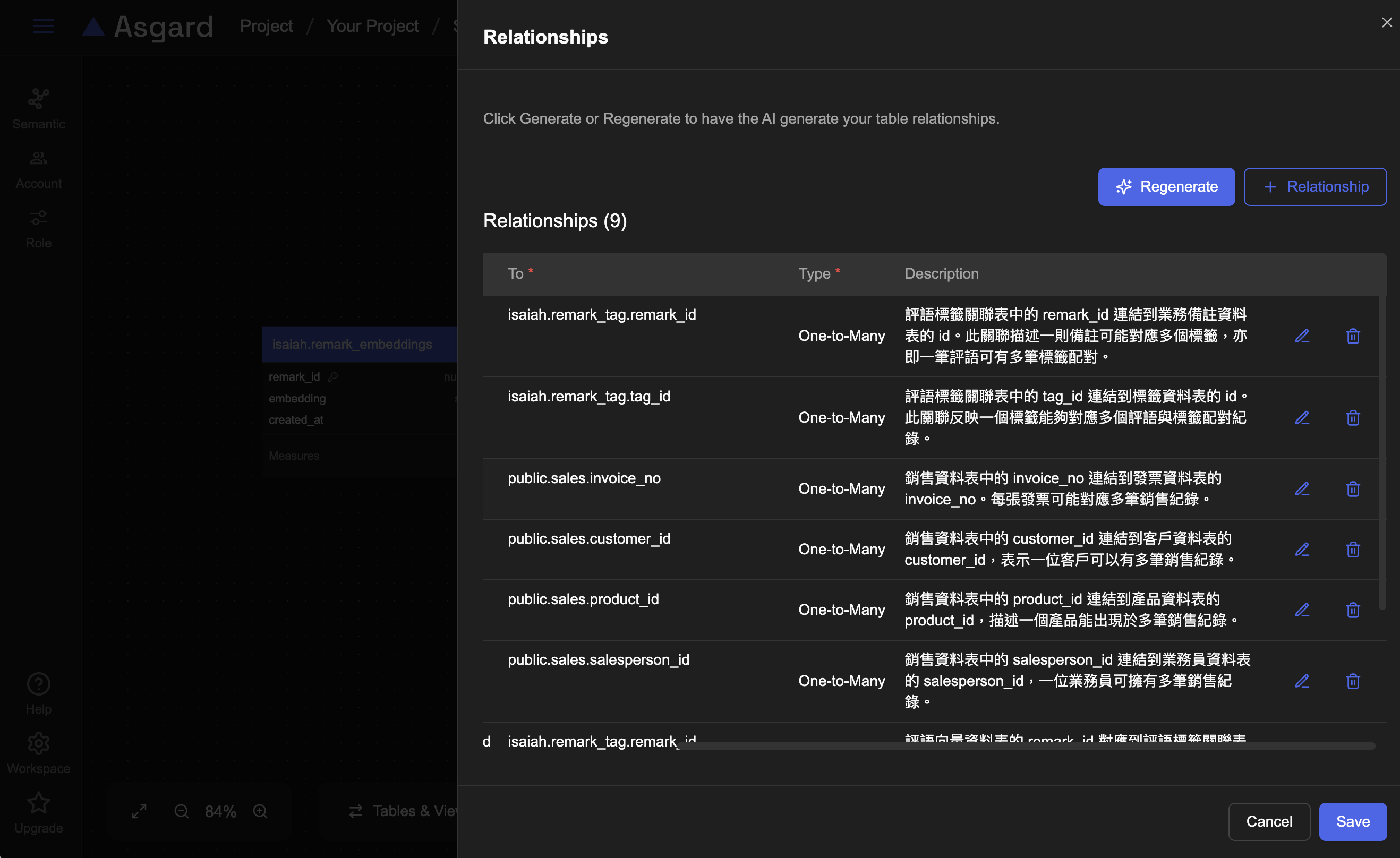 Relation 是資料表之間的關聯性 (例如訂單表與客戶表的連結),在 Semantic Layer 中設定 Relation,可以幫助 AI 理解不同資料表之間的邏輯關係,讓查詢與圖表生成更正確。