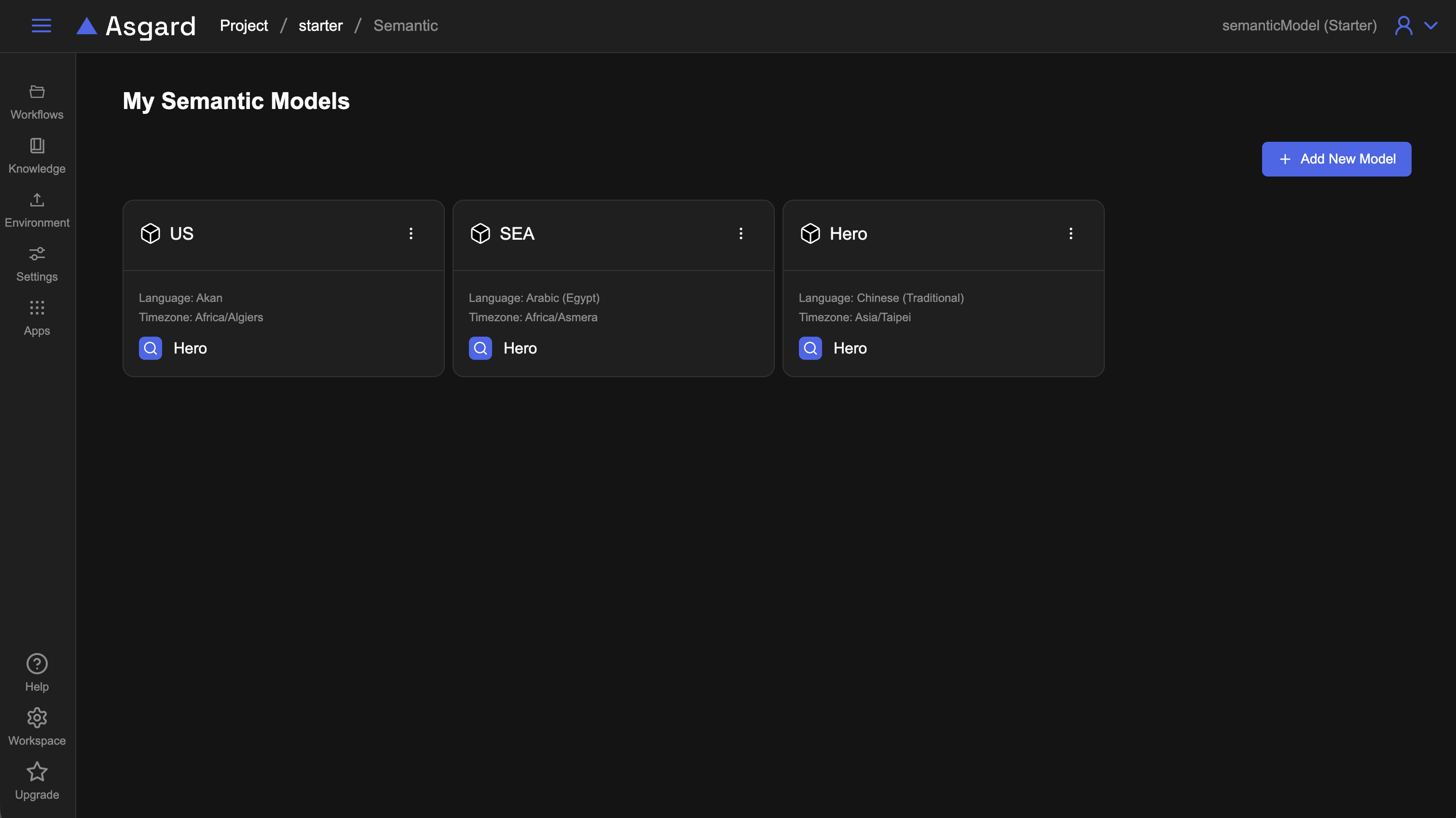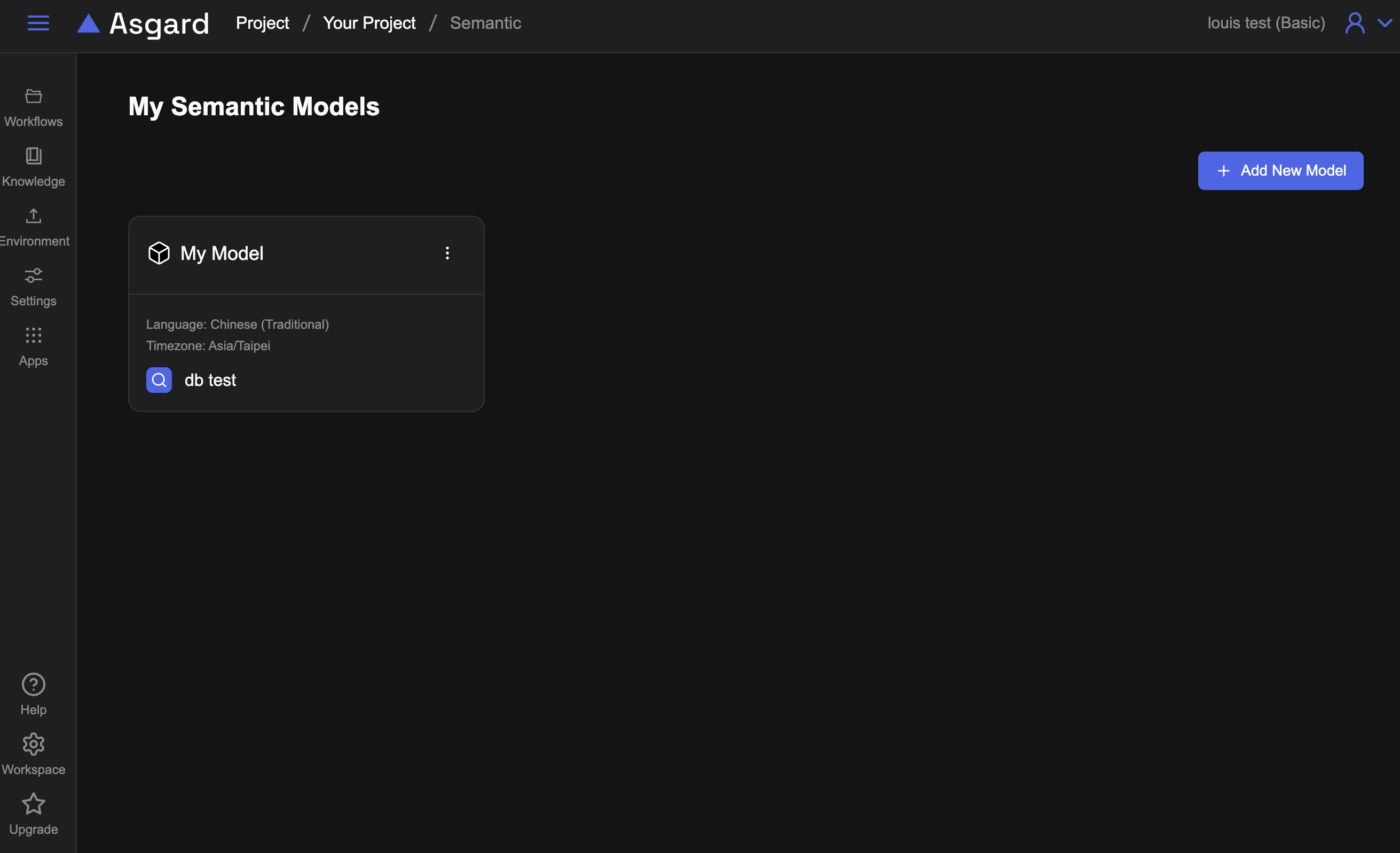 開始使用 AsgardSemantic Model新增語意資料模型On this page新增語意資料模型本頁說明如何: 連結既有資料庫(MySQL、PostgreSQL…等)。 系統如何自動讀取 schema,並建立初步的語意模型。 使命名與描述模型,方便團隊使用。 前置作業 可供連線的資料庫。 在 Settings 裡新增 Data Source 資料庫連線設定。 新增 Semantic Model 基本資訊